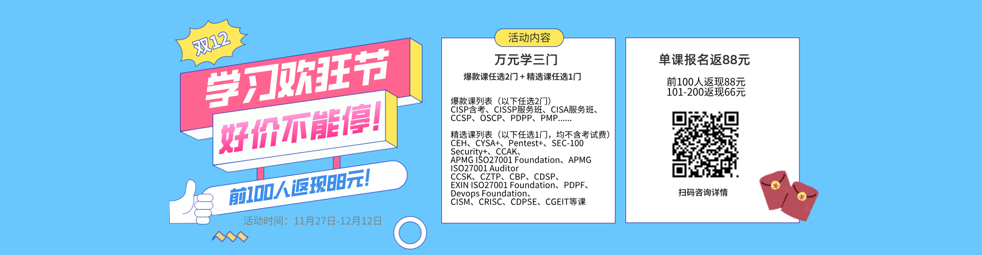 国际化视野、专业而全面、理论与实战相结合、独具匠心的信息安全课程体系,涵盖IT治理、信息安全管理、信息安全技术、信息系统审计、安全运维、新技术等。